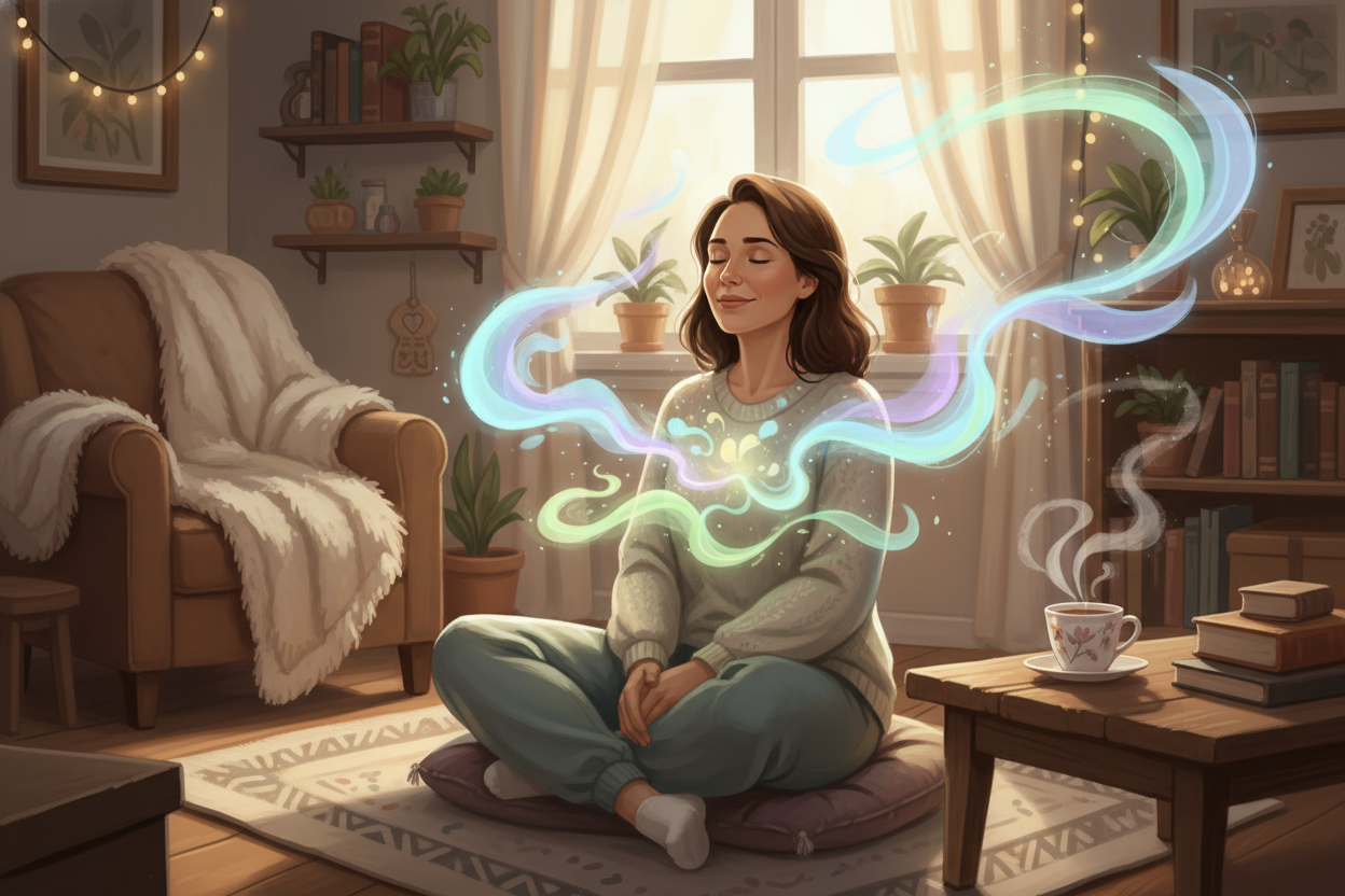 2. Пошаговые действия (3-4 простых шага, например: "Выключи все экраны", "Зажги свечу", "Сделай 5-минутную легкую растяжку", "Выпей чашку травяного чая, сосредоточившись на его вкусе").