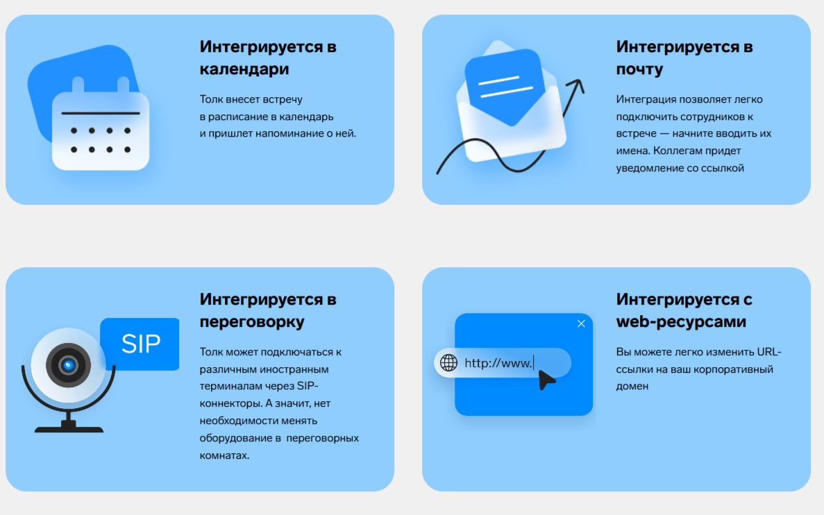 - Интеграция с оборудованием — сервис поддерживает конференции с участием ВКС-терминалов по протоколу SIP (можно подключить Polycom, Cisco и другие аппаратные терминалы).